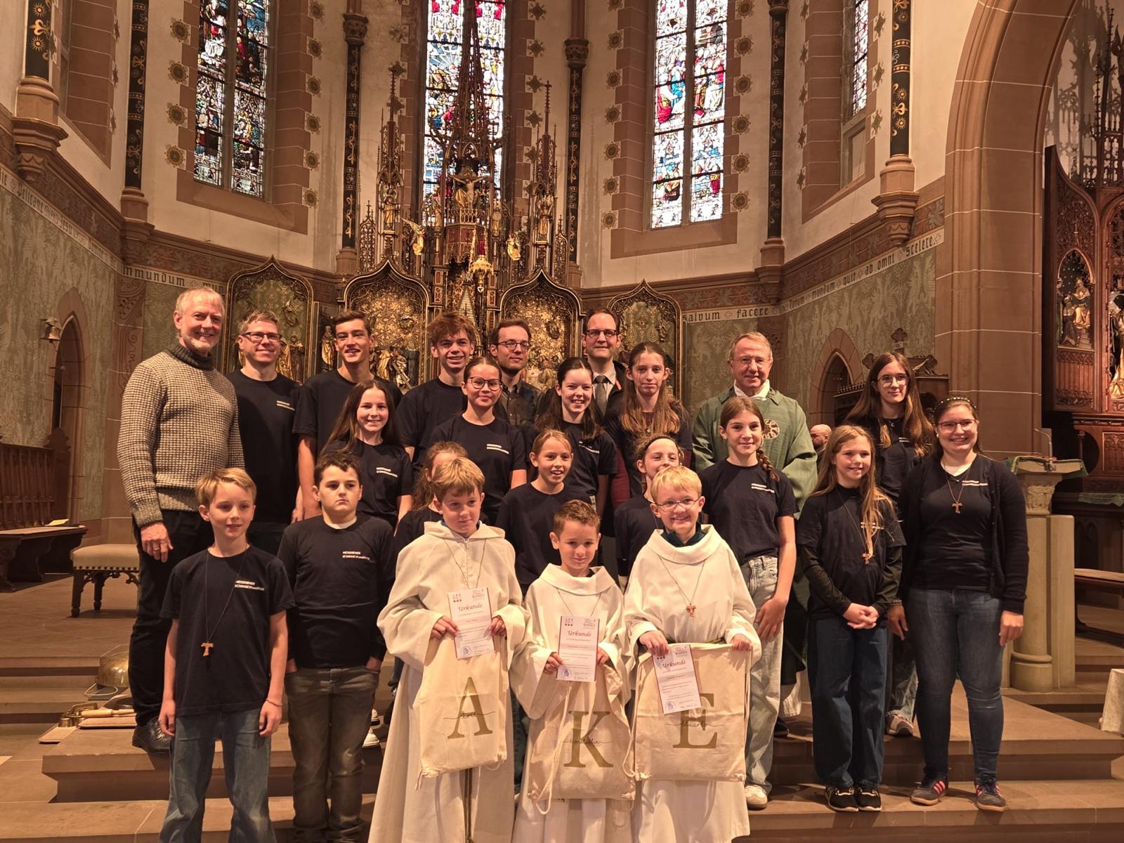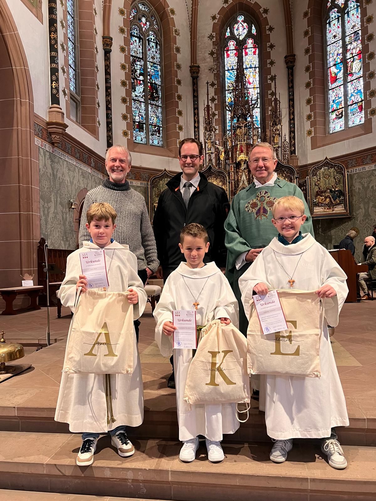 Nach der Predigt wurden drei neue Messdiener feierlich in die große Schar der Messdienerinnen und Messdiener aufgenommen. Dazu gab es begrüßende Worte von Roman Monzel, während Valerie Heinz die Urkunden und Gemeindereferent Rüdiger Glaub-Engelskirchen die Kreuze überreichten.