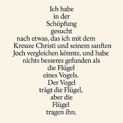 Das Gottesloblied „Bleibe bei uns“ (GL 325) bringt in der zweiten Strophe schön zum Ausdruck, wie es den Jüngern Jesu erging: „(…) Wir flohen fort vom Kreuz (…)“. Selbst die ersten Jünger sind geflohen - konnten den Anblick des Kreuzes nicht ertragen. Doch das Kreuz ist mehr als nur ein Hinrichtungsinstrument. Für uns Christen ist es ein Zeichen der Hoffnung. Gott Vater hat seinen Sohn nicht vergessen. Jesus Christus ist auferstanden und hat Leid und Tod, das Kreuz, besiegt. Das Kreuz ist beides: Ort der tiefsten Trauer, des Schmerzes, des Leids, der Angst, der Einsamkeit, des Verlassen-Seins. Doch auch Zeichen der Hoffnung und des Sieges über all das. Das Zitat von Bernhard von Clairvaux deutet geheimnisvoll unsere Hoffnung an. Wie die Flügel zum Vogel gehören, so gehören auch solche genannten Momente zu unserem Leben dazu. Doch wir sind ihnen nicht allein ausgesetzt. Gott steht uns bei. Er ist derjenige, der uns immer wieder aufrichtet. Durch seinen Sohn Jesus ist ihm unser Leid nicht fremd. Er hat Mitleid mit uns und möchte uns, gerade in solchen Momenten, tragen. Im genannten Gottesloblied heißt es dann weiter: „(…) Doch du, Verlorener, führtest uns bereits (…)“.